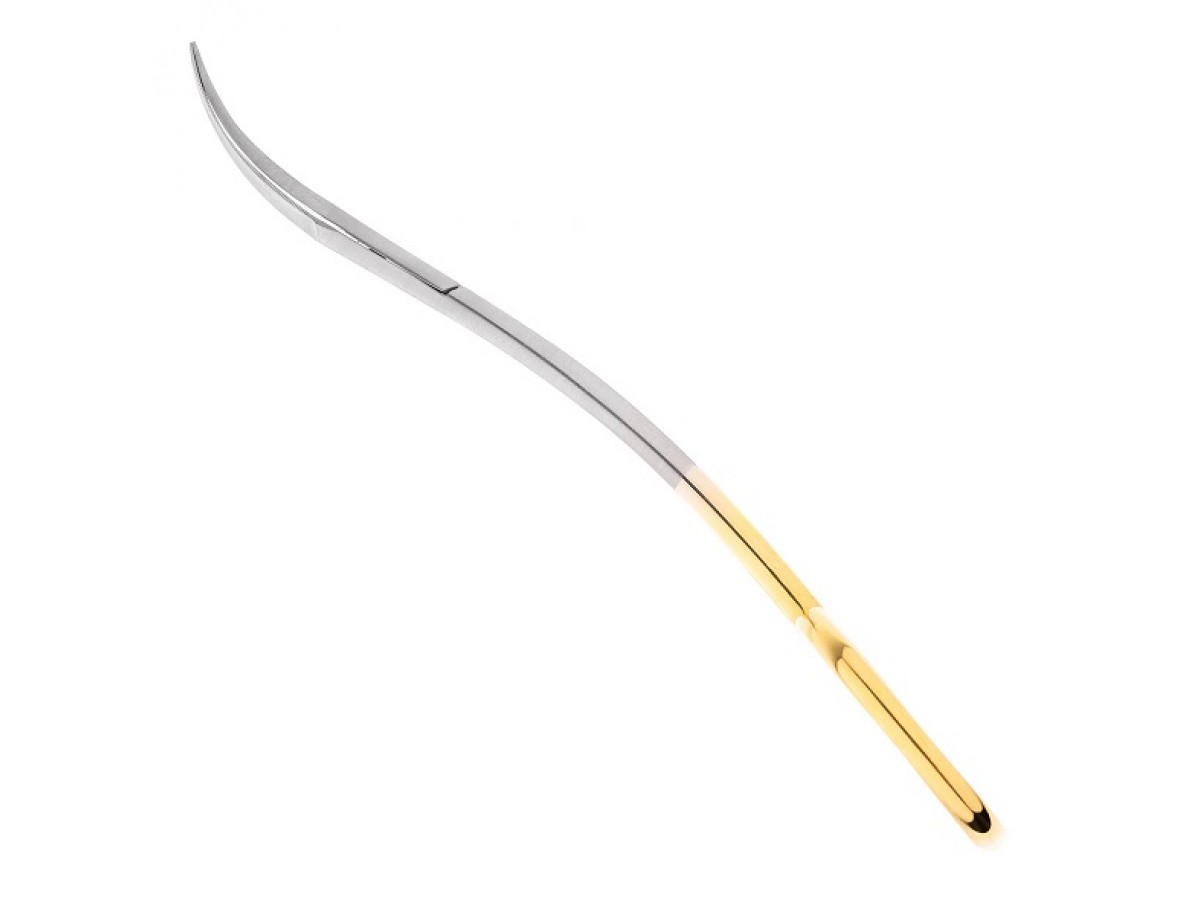 - Инструмент имеет двойной изгиб по плоскости, который облегчает введение ножниц глубоко в полость рта.