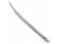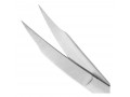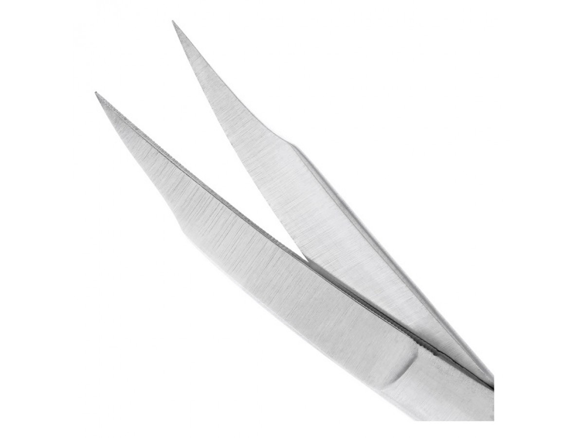 - Рабочая часть ножниц изогнута по плоскости, что способствует введению инструмента в глубокорасположенные участки полости рта. Одно из самозатачивающихся лезвий имеет зубчатую режущую поверхность, предотвращающую скольжение инструмента по поверхности мягких тканей. Симметричные заостренные рабочие части ножниц истончаются к вершине. Такая конструкция лезвий облегчает проведение операции по коррекции мягких тканей в полости рта.