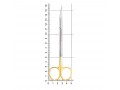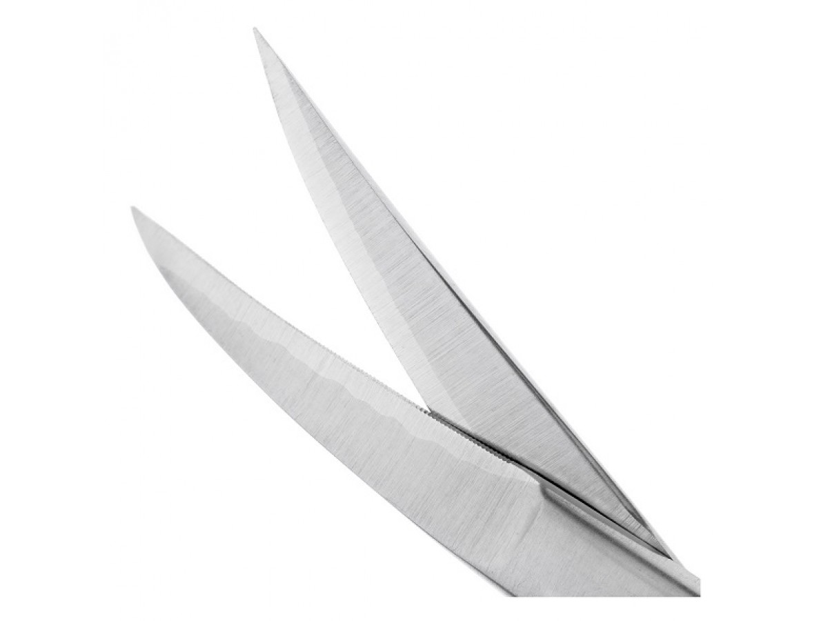 - Лезвия ножниц имеют вставки из твердого сплава карбид-вольфрама, которые обеспечивают повышенную устойчивость к истиранию. Зубчатая режущая грань на одной из рабочих поверхностей препятствует скольжению инструмента по плоскости мягких тканей, что упрощает проведение полостных операций. Рабочая часть ножниц треугольной стандартной формы с острым тонким лезвием, которое без затруднений разрезает мягкие ткани в ротовой полости.