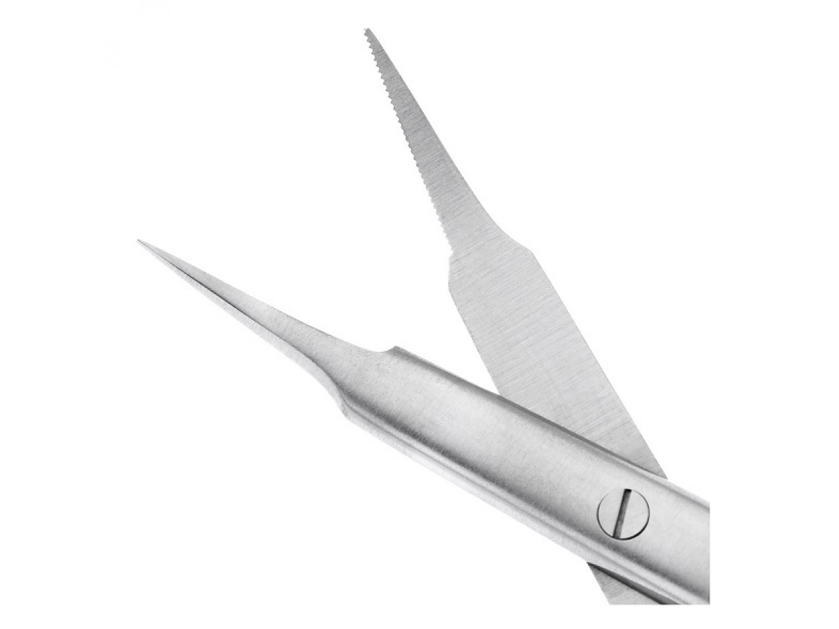 - Рабочая часть ножниц изогнута по плоскости, что способствует введению инструмента в глубокорасположенные участки полости рта. Одно из самозатачивающихся лезвий имеет зубчатую режущую поверхность, которая уменьшает шанс проскальзывания инструмента по плоскости мягких тканей. Симметричные заостренные рабочие части ножниц истончаются к вершине. Такая конструкция лезвий облегчает проведение операции по коррекции мягких тканей в полости рта.