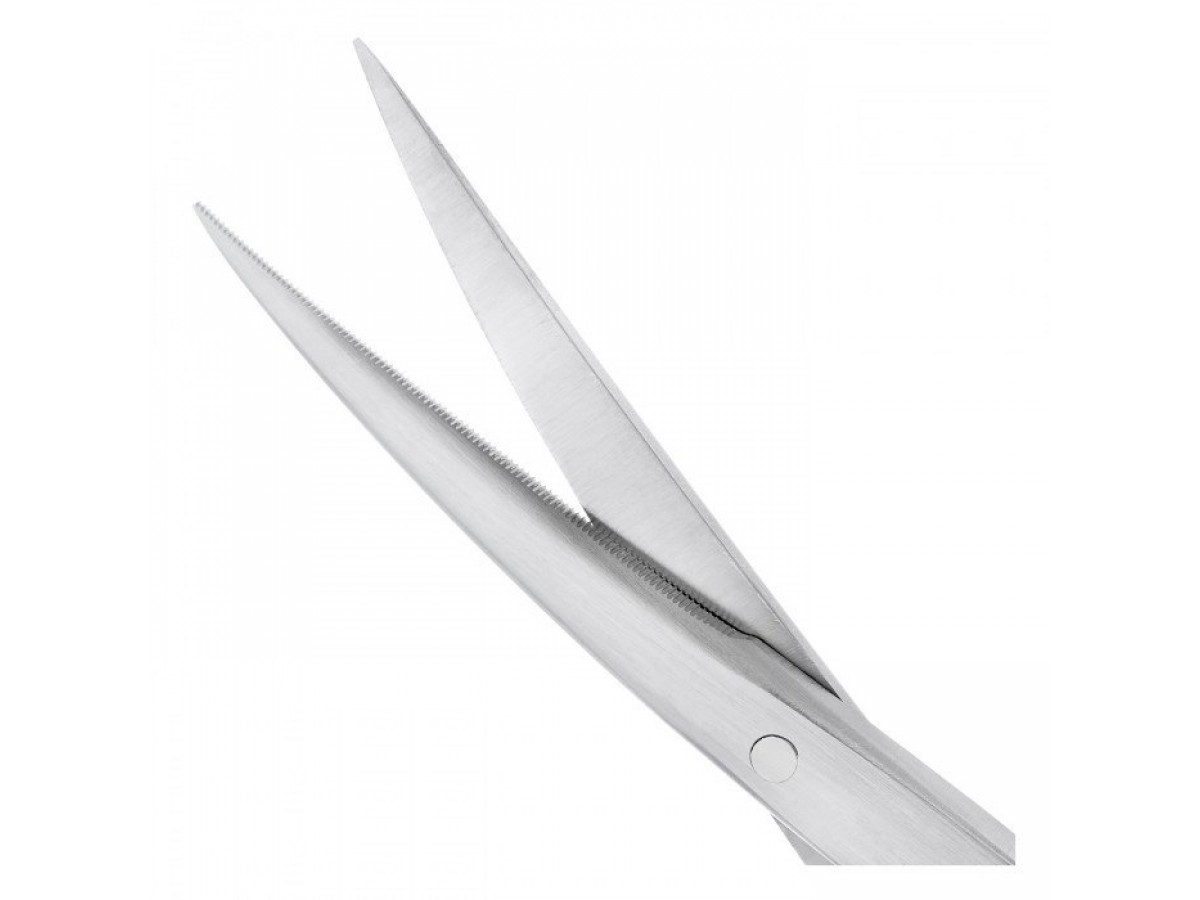 Лезвия ножниц стандартной треугольной формы с тонкими, острыми режущими краями. Изгиб по плоскости в рабочей части способствует коррекции мягких тканей в глубоких и труднодоступных участках полости рта.
