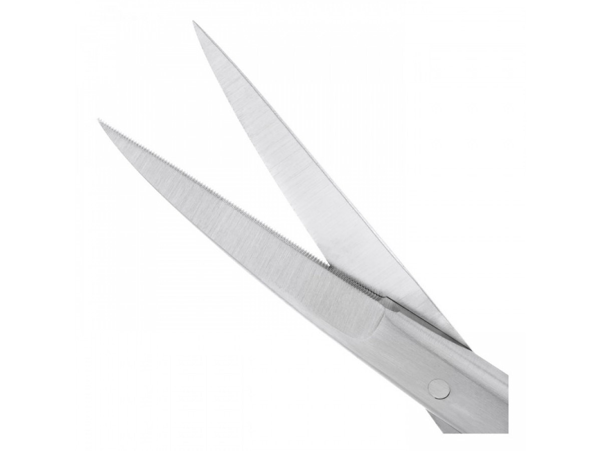 Лезвия ножниц стандартной треугольной формы с тонкими, острыми режущими краями. Изгиб по плоскости в рабочей части способствует коррекции мягких тканей в глубоких и труднодоступных участках полости рта.