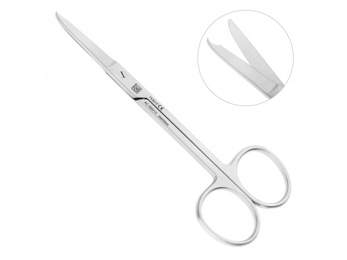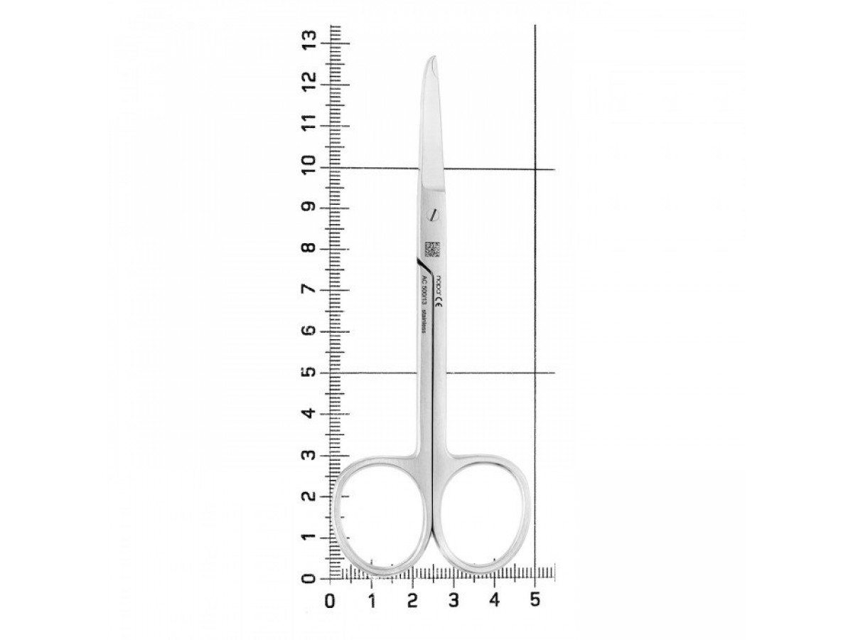 Одно из лезвий ножниц Spencer закругленное, а второе — с выемкой. Инструмент изготовлен из нержавеющей стали, что позволяет использовать его много раз, предварительно продезинфицировав.