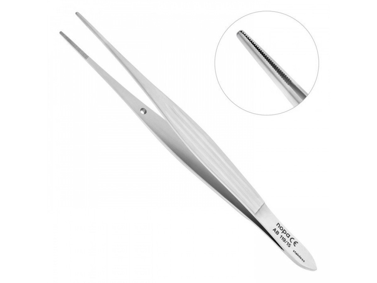 Прямые рабочие части инструмента имеют продольные насечки на внутренней поверхности, способствующие плотной фиксации пинцета на поверхности рабочих материалов. Узкие, длинные, тонкие бранши инструмента позволяют осуществлять прецизионные манипуляции и обеспечивают максимальный обзор рабочего поля.