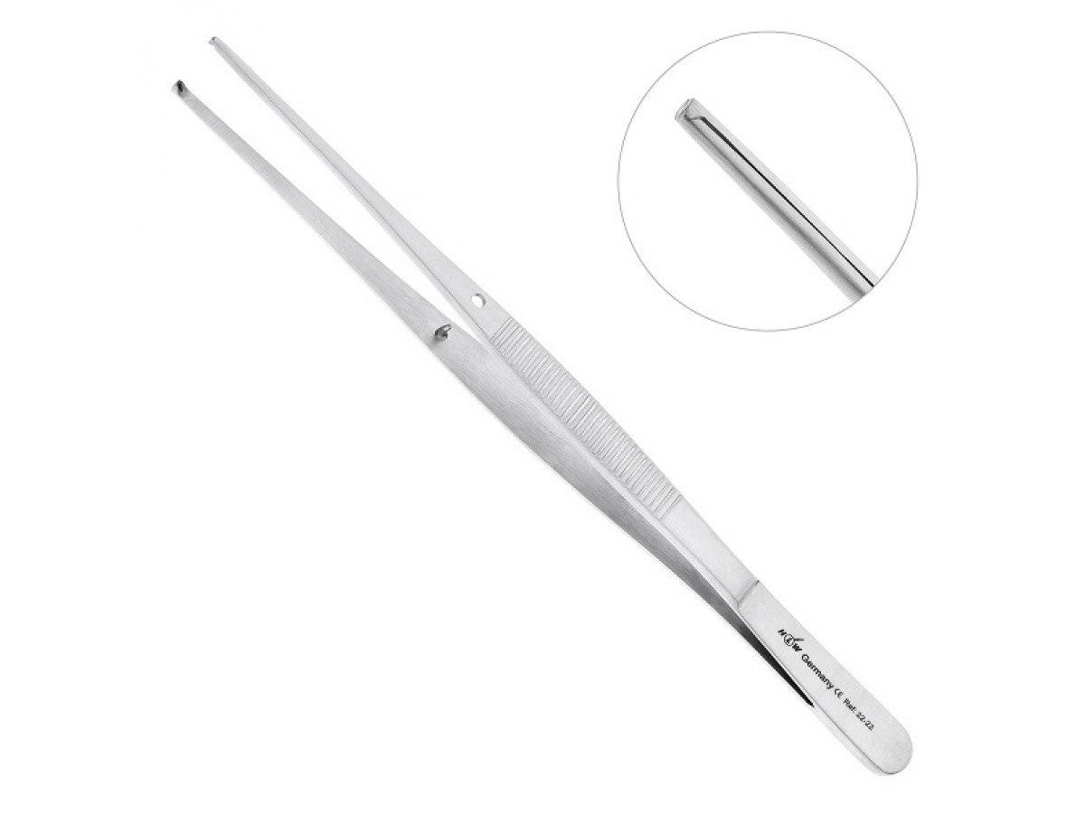 - Прямые рабочие части пинцета имеют зубчатые элементы на концах внутренних поверхностей, благодаря чему инструмент надежно фиксируется на мягкотканном лоскуте, не приводя к плоскостному сдавливанию тканей. Тонкие и узкие бранши хирургического пинцета обеспечивают хорошую визуализацию рабочего поля при манипуляциях в полости рта.