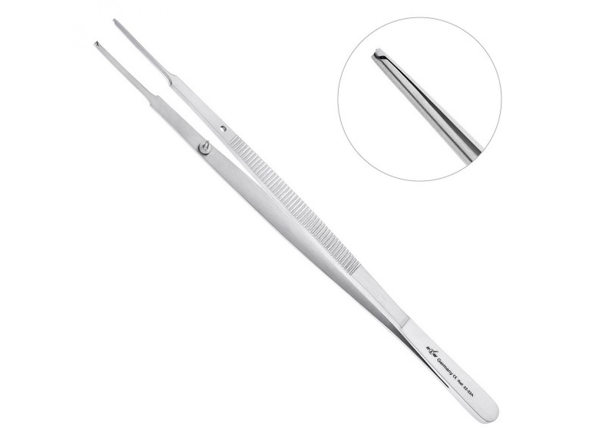 - Узкие, вытянутые и тонкие рабочие части инструмента позволяют осуществлять прецизионные манипуляции и обеспечивают максимальный обзор рабочего поля. Благодаря зубчатым элементам на окончании рабочей части пинцет плотно удерживает мягкотканный лоскут, не приводя к плоскостному сдавливанию тканей.