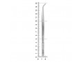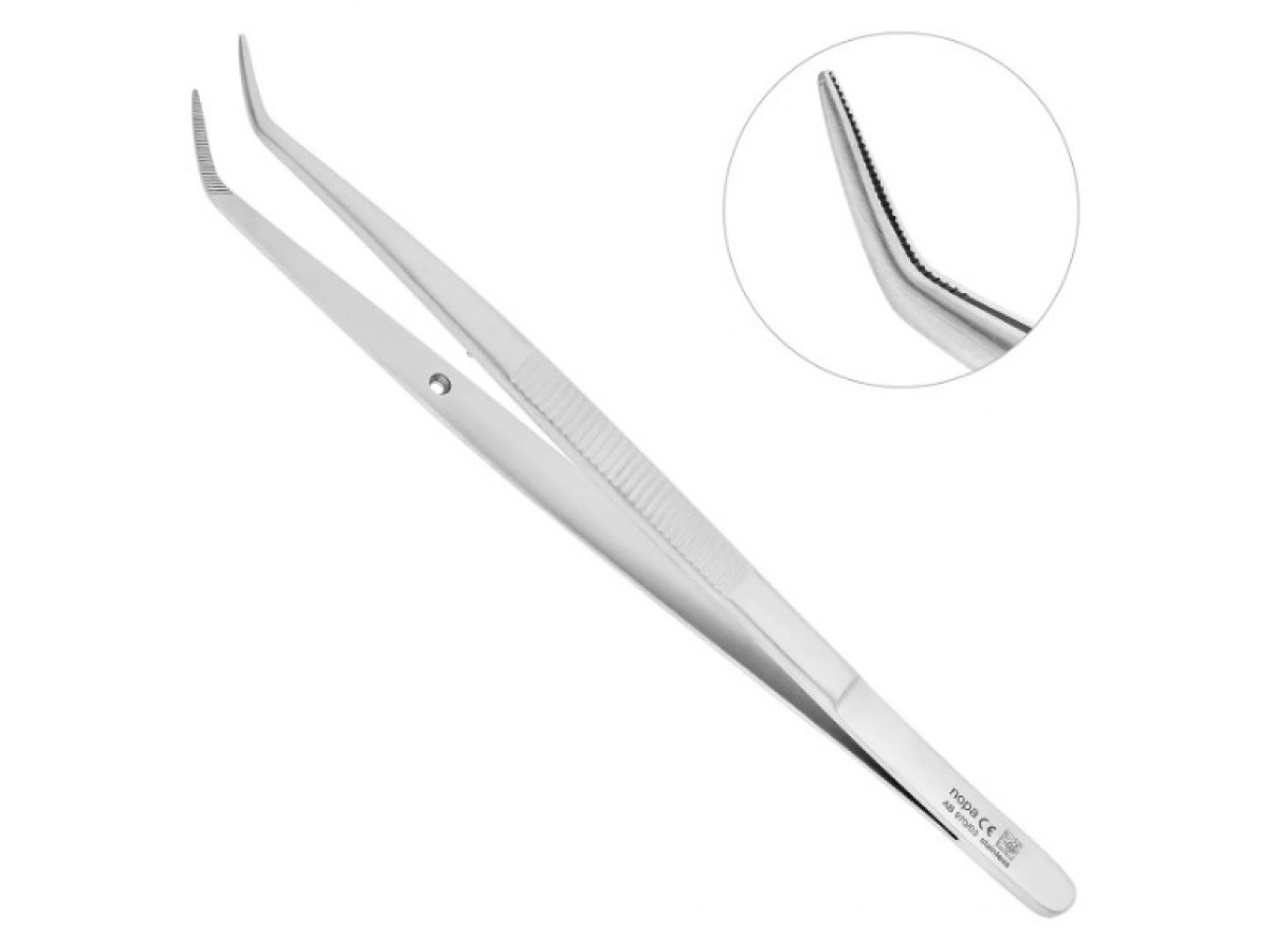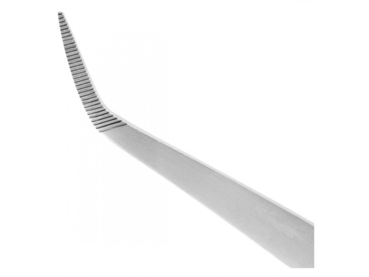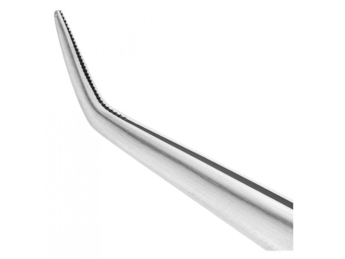 Рабочая часть пинцета имеет изгиб по плоскости, что способствует введению инструмента в глубокие и труднодоступные участки полости рта. Внутренние поверхности браншей пинцета имеют поперечные насечки для деликатного захвата и удерживания мягких тканей в ротовой полости.