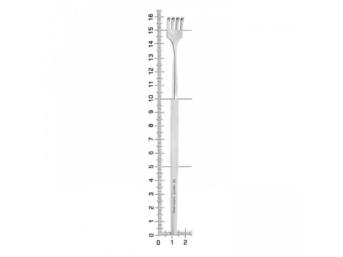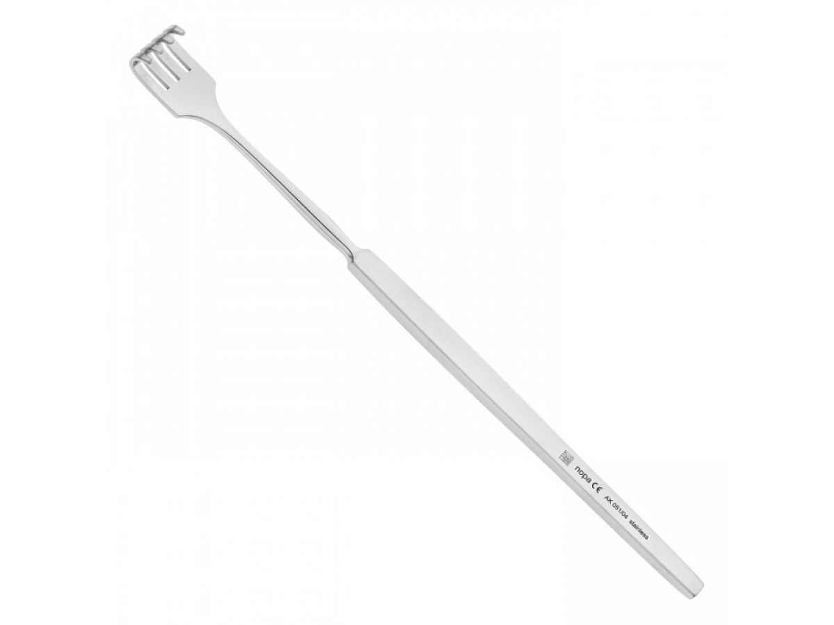 Рабочая часть ретрактора имеет четырёхзубый изогнутый крючок для фиксации слизисто-надкостничного лоскута в заданном хирургом положении. Изгиб по плоскости в рабочей части инструмента обеспечивает хорошую поддержку мягких тканей и делает отведение менее травматичным.