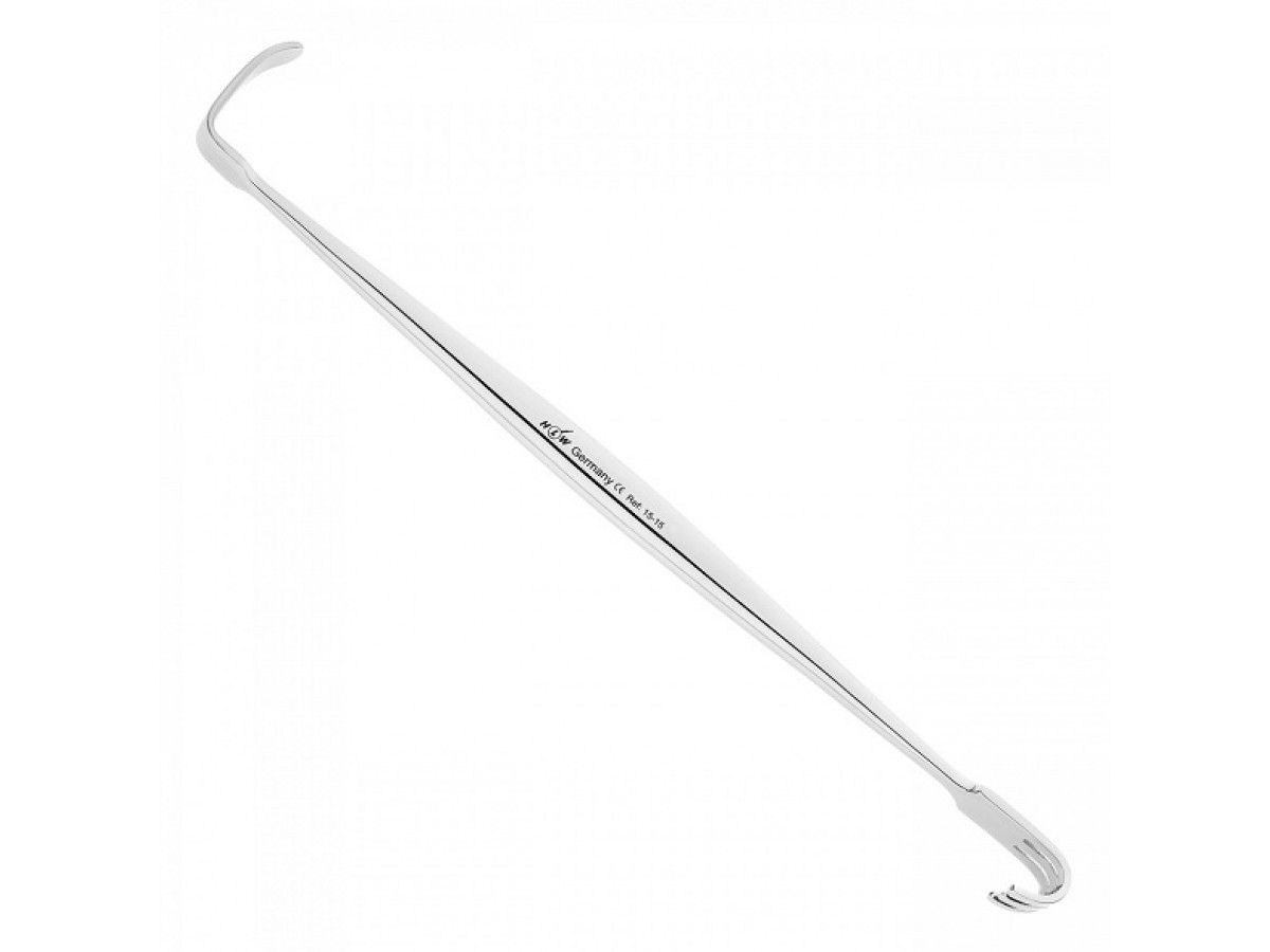 - С обоих концов инструмента расположены изогнутые рабочие части. Одна сторона роторасширителя заканчивается прямоугольной пластиной, которая отклонена от длинной оси на 900 и на конце имеет небольшой округлый изгиб. На другом конце инструмент имеет трёхзубый изогнутый крючок для фиксации слизисто-надкостничного лоскута в заданном хирургом положении.
