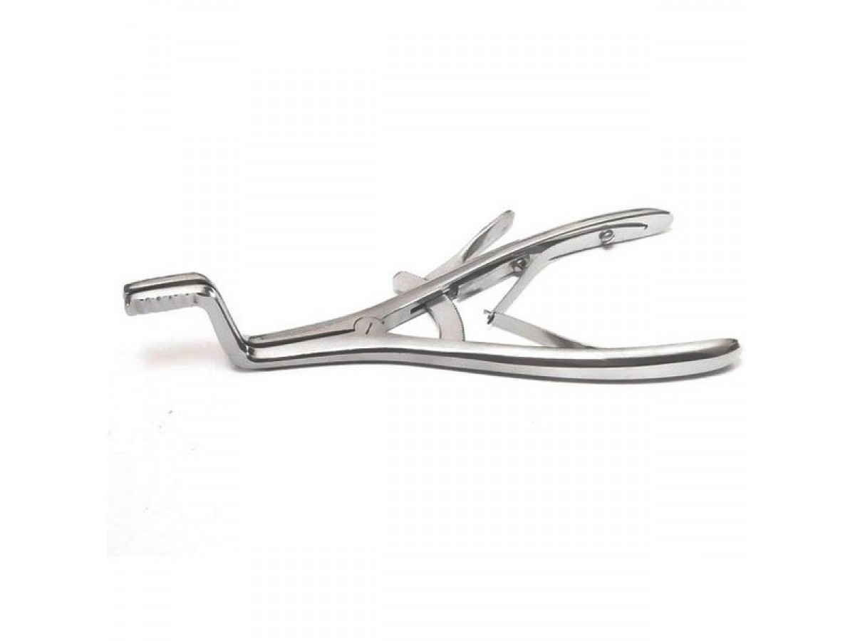 Роторасширитель с кремальерой 160 мм (детский) — оттесняющий медицинский инструмент для разведения челюстей и удержания рта открытым при осмотре и лечебных манипуляциях. Фиксировать роторасширитель в нужном положении позволяет ступенчатая кремальера. Рабочие губки изогнутые. Производитель: Sammar, Пакистан.