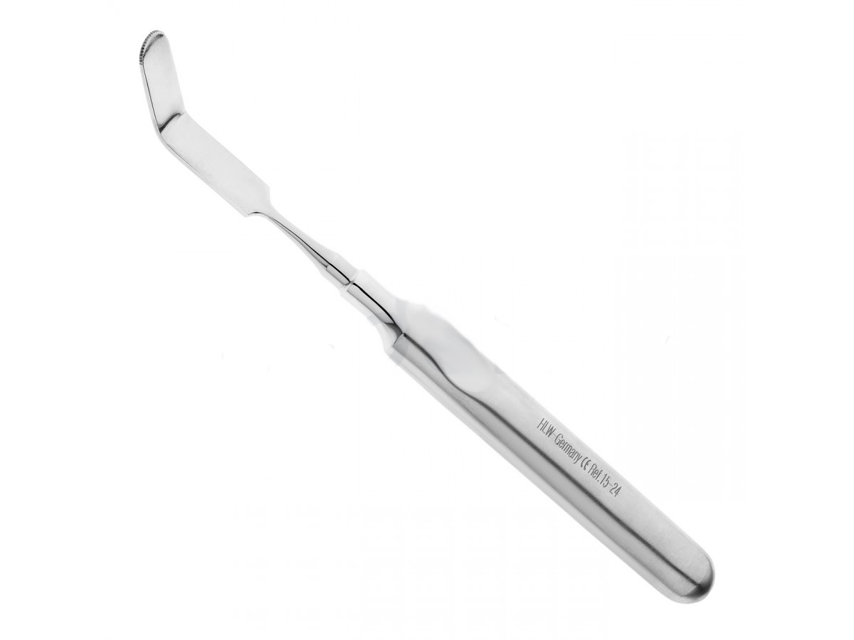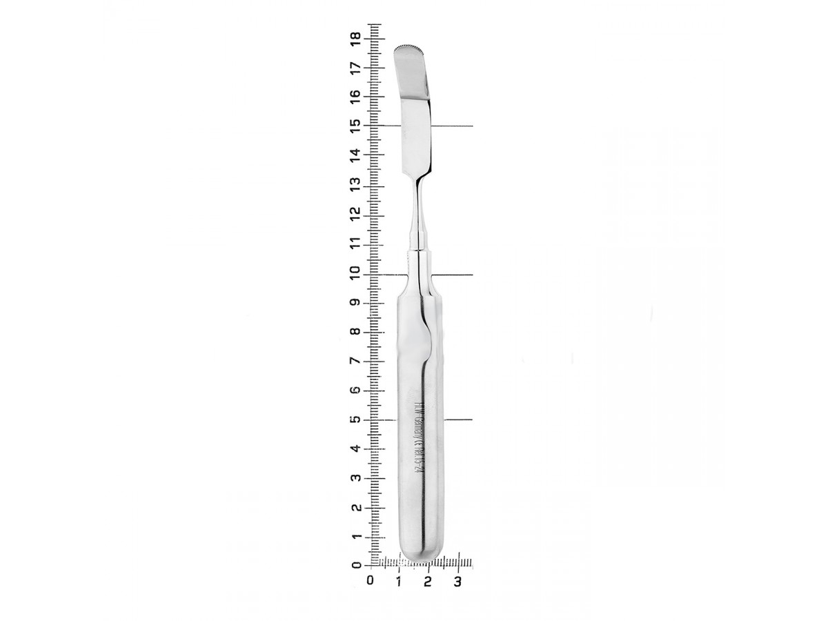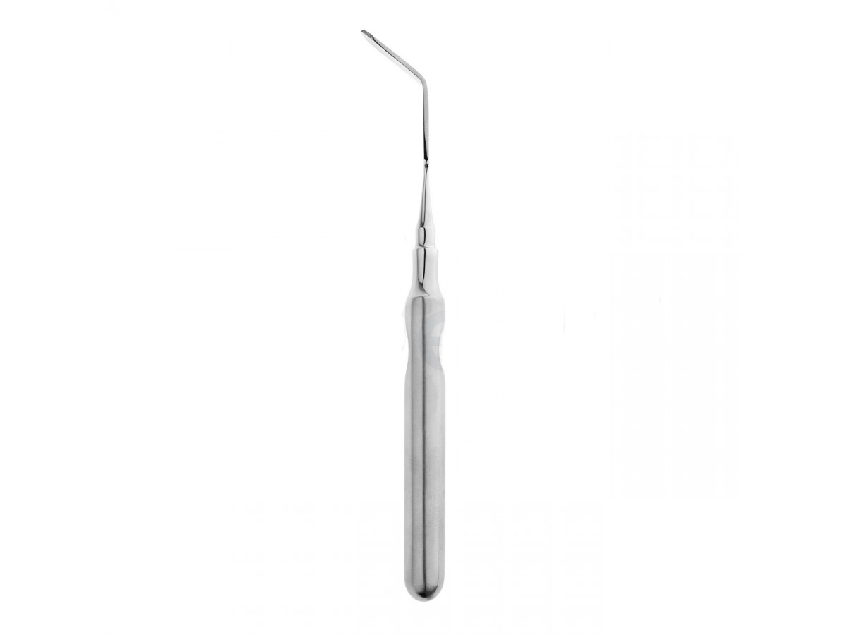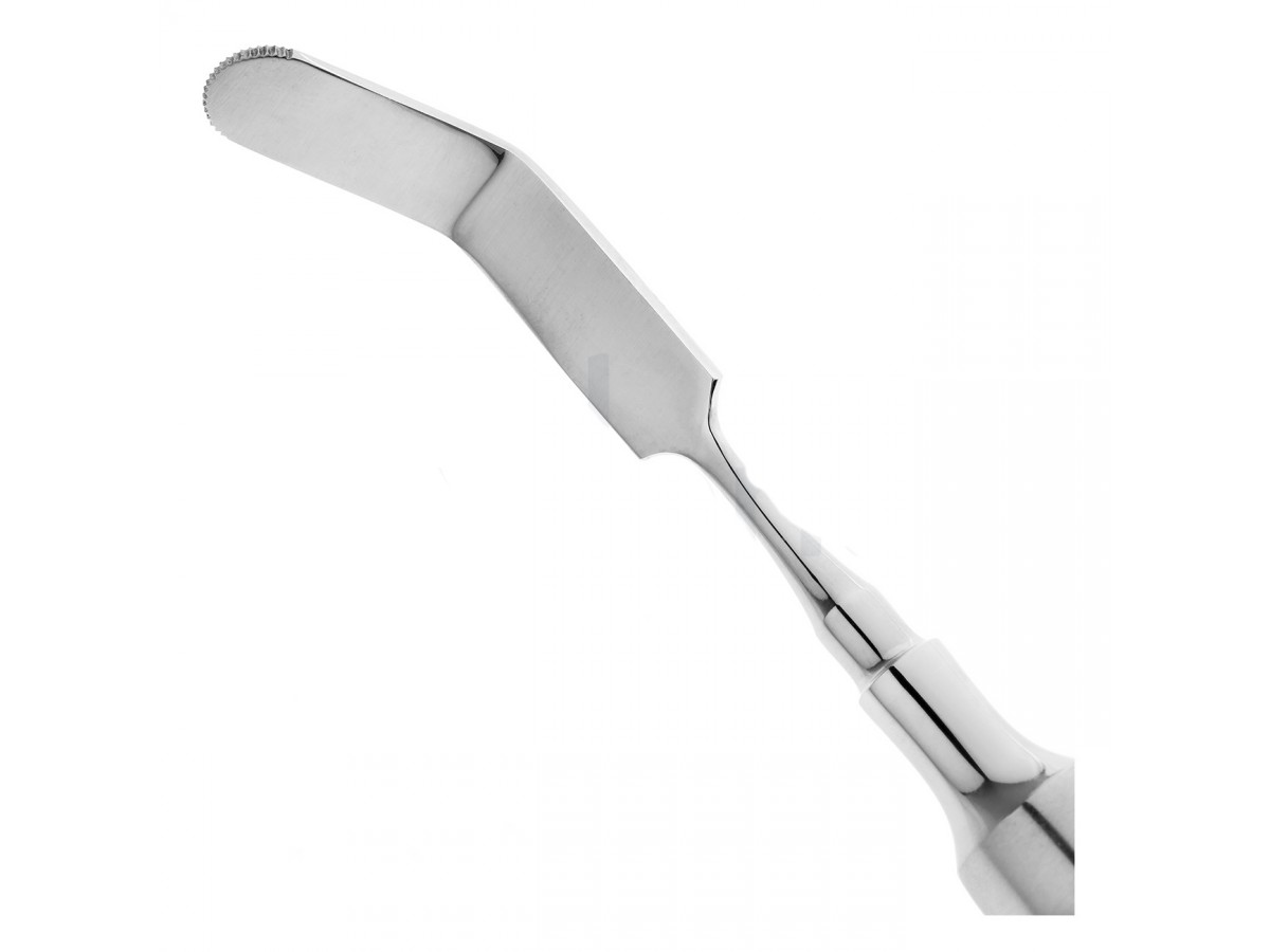 - Удлиненная рабочая часть и тройной штыковидный изгиб по плоскости позволяют использовать инструмент на труднодоступных участках полости рта. Зубчики на конце рабочей поверхности надежно крепятся на лоскуте мягких тканей и предотвращают его выскальзывание.
