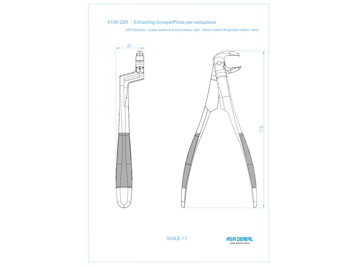 Щипцы №22R для удаления зубов для нижних и правых третьих моляров с зубчиками 0100-22R. Производитель: Asa Dental, Италия.