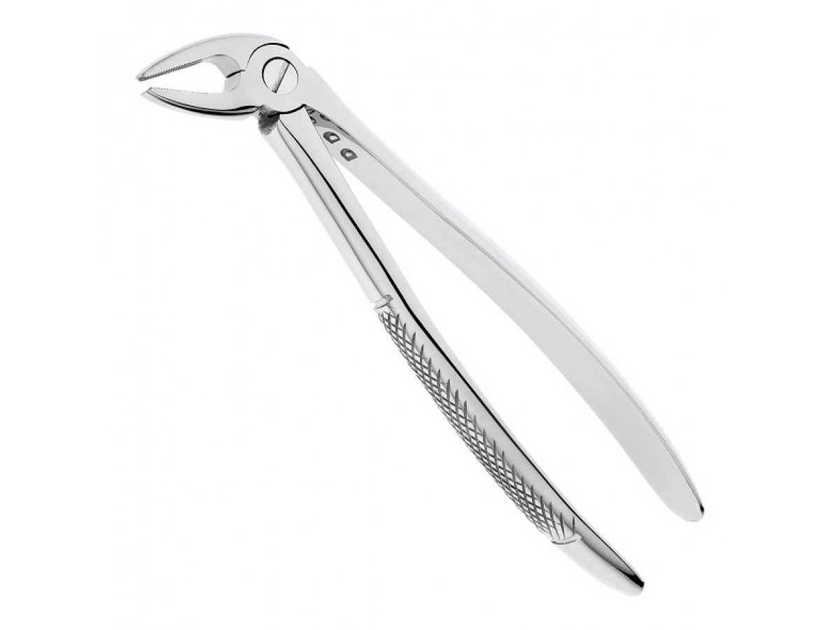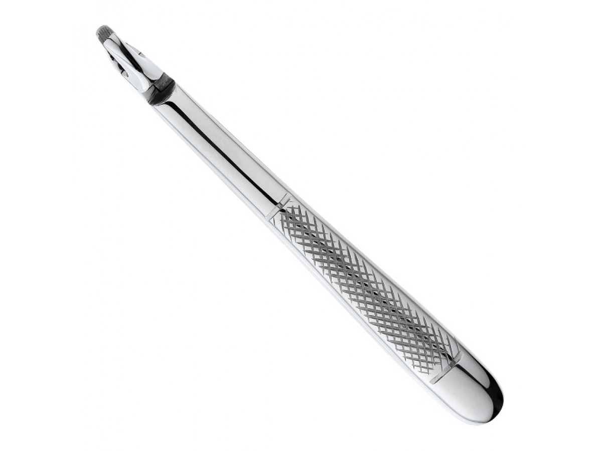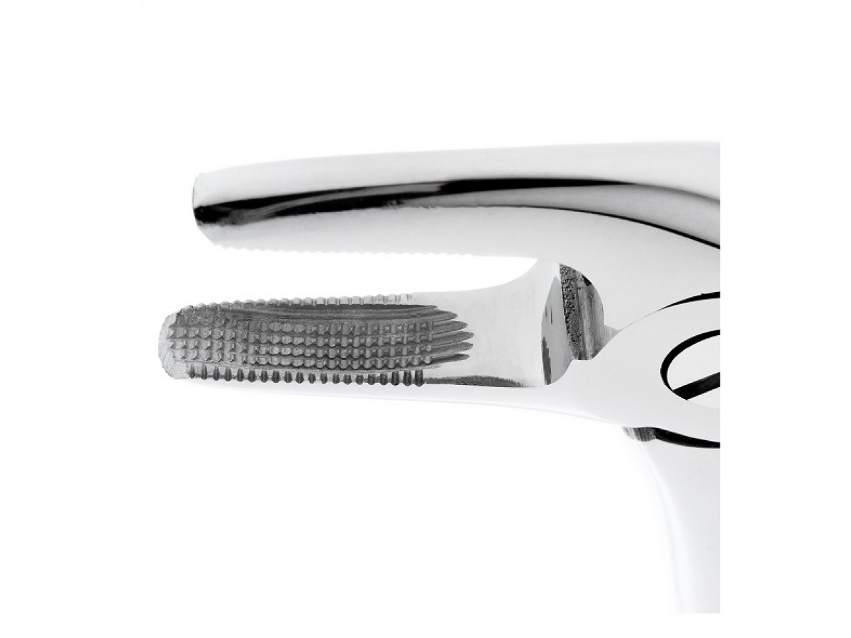 - Щипцы имеют несходящиеся, удлиненные рабочие части, что способствует удалению зубов в труднодоступных участках полости рта. Продольно-поперечные насечки на внутренних поверхностях щечек инструмента обеспечивают надежную фиксацию щипцов на корне зуба.