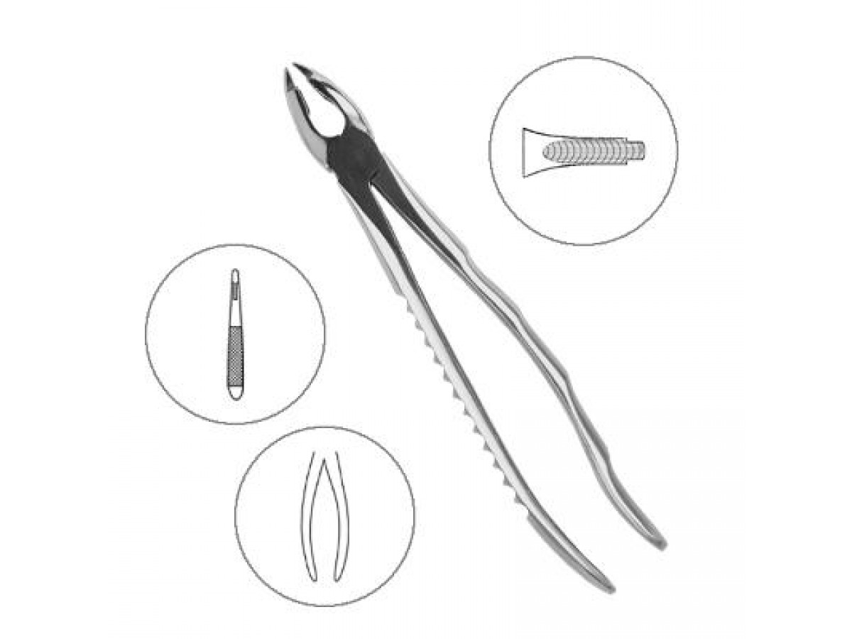 - Рабочие части инструмента не сходящиеся, имеют вогнутости среднего размера на внутренних поверхностях щечек, которые покрыты продольно-поперечными насечками для предотвращения их проскальзывания по поверхности удаляемого зуба.