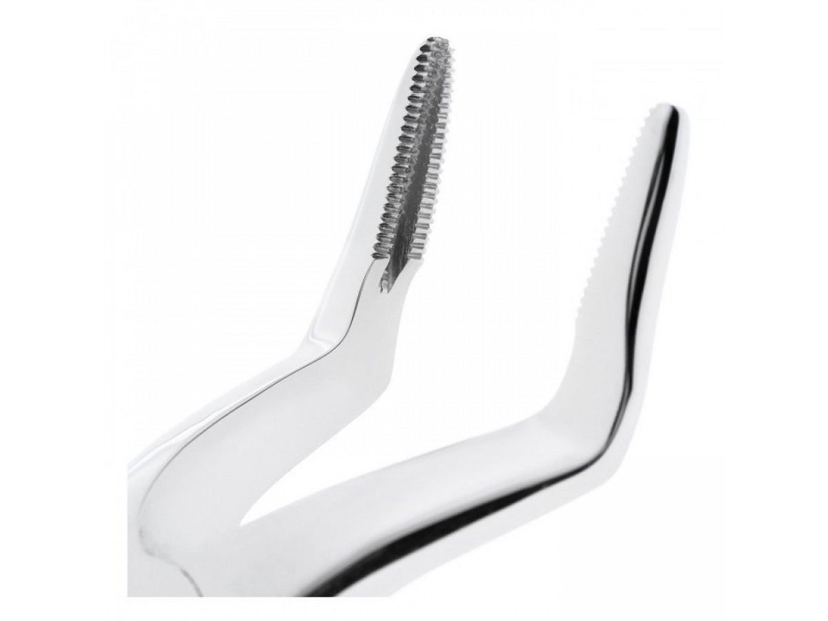 Байонетная рабочая часть щипцов имеет узкую и длинную форму, сходящиеся на конце щечки, а также продольно-поперечные насечки на внутренней поверхности. Такая конструкция инструмента облегчает доступ к корням зубов при работе в любом квадранте верхней челюсти.