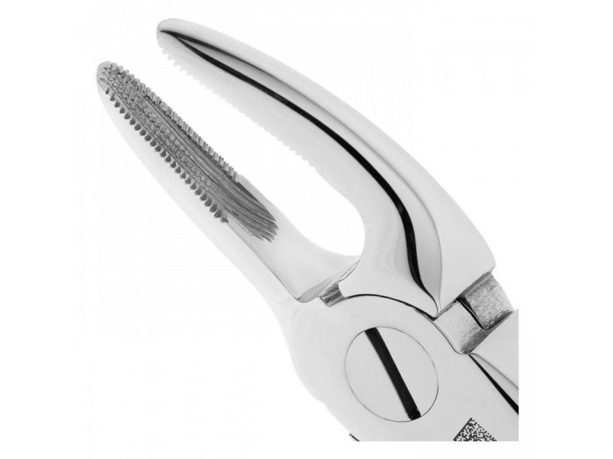 Сходящиеся рабочие части щипцов имеют продольно-поперечные насечки на внутренней поверхности. Эти щипцы можно использовать для работы с корнями зубов верхней челюсти во всех квадрантах за счет удобной S-образной формы изгиба. Такая форма позволяет работать как с фронтальной группой зубов, так и в жевательном отделе.