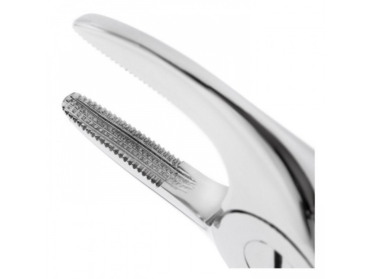 Узкие и удлиненные рабочие части щипцов предназначены для работы с корнями зубов нижней челюсти во всех квадрантах. Продольно-поперечные насечки на внутренних поверхностях щечек инструмента обеспечивают надежную фиксацию щипцов на корне зуба.
