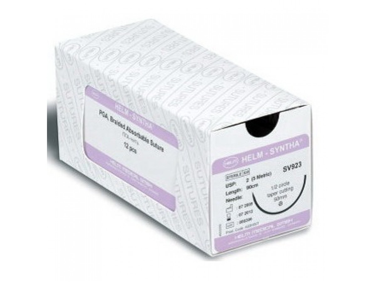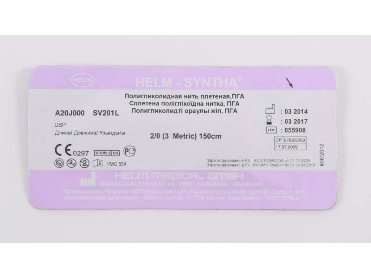 ПГА-нить (полигкликолидная нить) HELM-SYNTA® - синтетический рассасывающийся стерильный хирургический шовный материал, состоящий из гомополимера полигликолевой кислоты с покрытием из стеарата кальция и поликапролактона. Производитель: HELM, Германия.