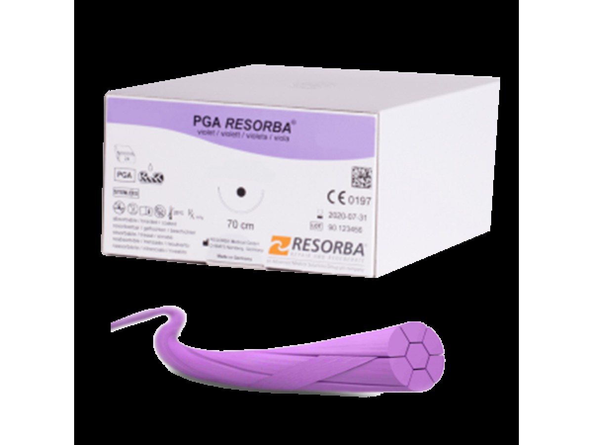 ПГА-РЕСОРБА представляет собой синтетический, стерильный хирургический рассасывающийся шовный материал, состоящий из полимера гликолевой кислоты. Плетеная нить снабжена покрытием из резолактона (смесь стеарата кальция и поликапролактона). Это покрытие инертно, лишено антигенной активности и апирогенно. ПГА- РЕСОРБА окрашивается в ходе полимеризации путем добавления красителя D & C фиолетового № 2. Производитель: RESORBA®, Германия.