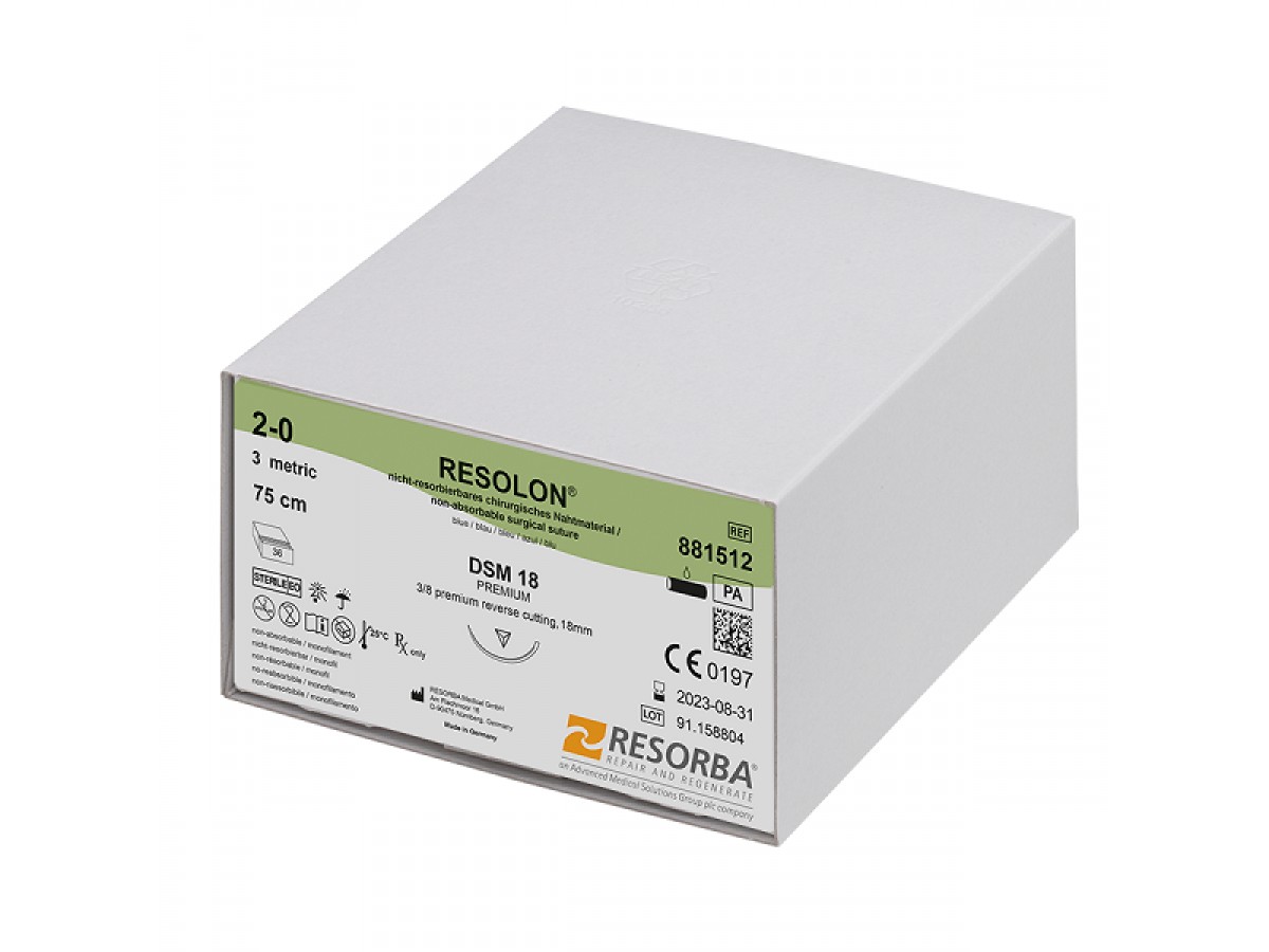 РЕЗОЛОН представляет собой монофиламентный нерассасывающийся хирургический шовный материал из полиамида 6. Полиамид 6 возникает в результате реакции полимеризации Е-капролактама. РЕЗОЛОН выпускается в синей окраске (кислотный синий CI 158). Производитель: RESORBA®, Германия.
