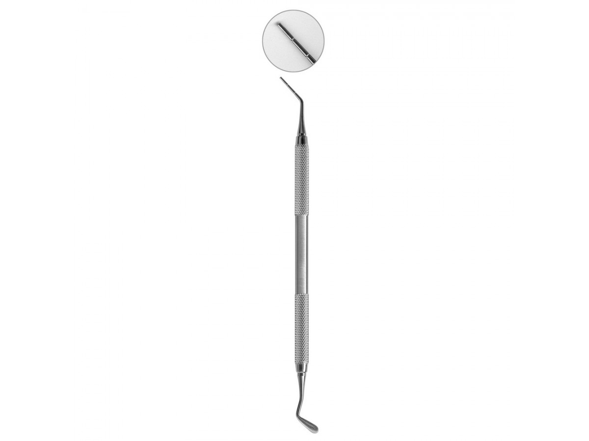 Цилиндрическая ручка стоматологического инструмента удобна в использовании и предотвращает скольжение фаланг пальцев в перчатке, благодаря ретенционным узорам на поверхности рукоятки.