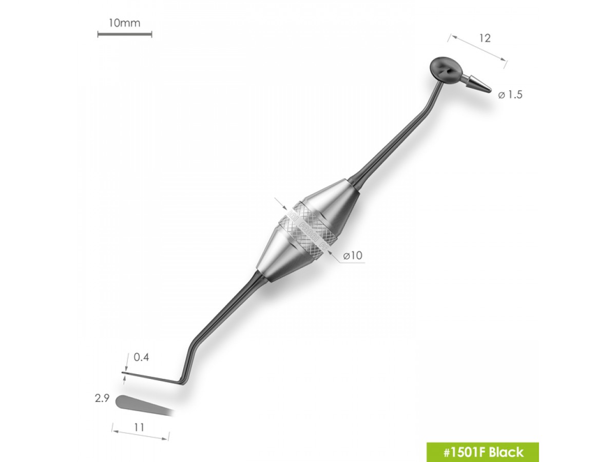 Окончания всех гладилок и всех конусовидных штопферов имееют правильную полусферическую форму. Толщина кончика гладилки составляет всего 0,4mm, при этом гладилка обладает небольшой степенью эластичности, но в целом остается достаточно жесткой. Сочетание этих факторов делает инструмент функциональным и изящным, что позволяет производить точные и деликатные манипуляции