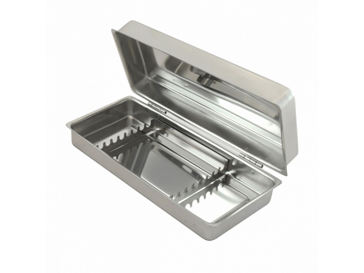 Крышка на петлях плотно прилегает к верхнему краю лотка, что обеспечивает защиту медицинского инструмента от попадания грязи и пыли, а также исключает возможность испарения дезинфицирующих средств.