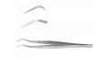 Двойной изгиб по плоскости облегчает ввод пинцета в глубокие и труднодоступные участки полости рта. Удлиненные и тонкие бранши инструмента обеспечивают хороший обзор операционного поля. Рабочие поверхности пинцета с внутренней стороны снабжены продольными атравматическими насечками для деликатного захвата и удерживания мягких тканей в ротовой полости.