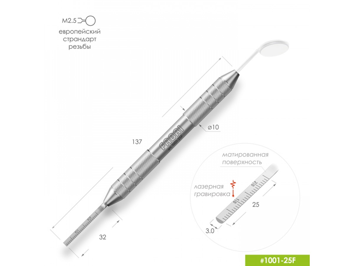 - Мерная шкала* с делениями 0-25 мм может применятся для определения рабочей длины эндодонтического инструмента, гуттаперчи и бумажных штифтов, а так же в ортодонтии для оценки вертикального перекрытия и сагиттальной щели. При эндо-манипуляциях с микроскопом данная ручка может быть особенно удобна т.к. для проведения измерений не требуется дополнительных действий, смены инструментов и перефокусировки зрения.