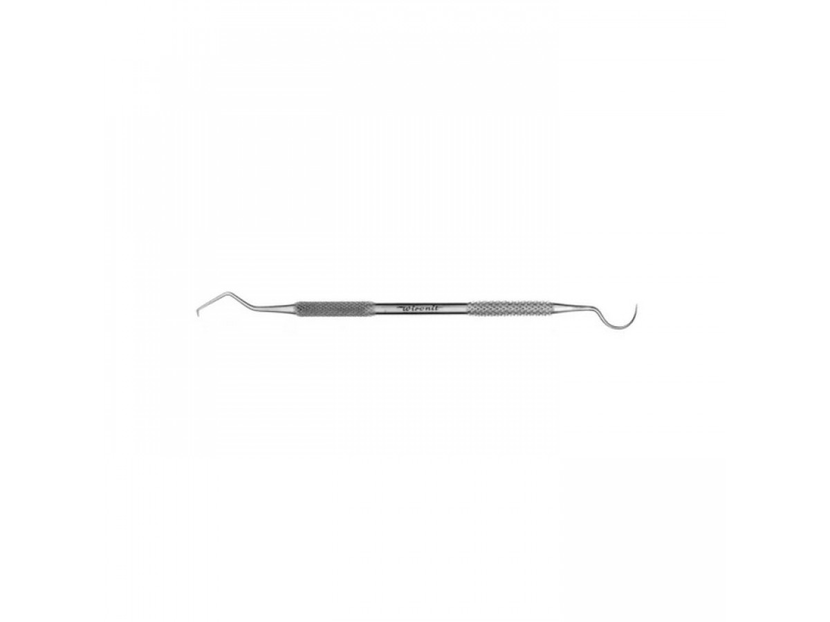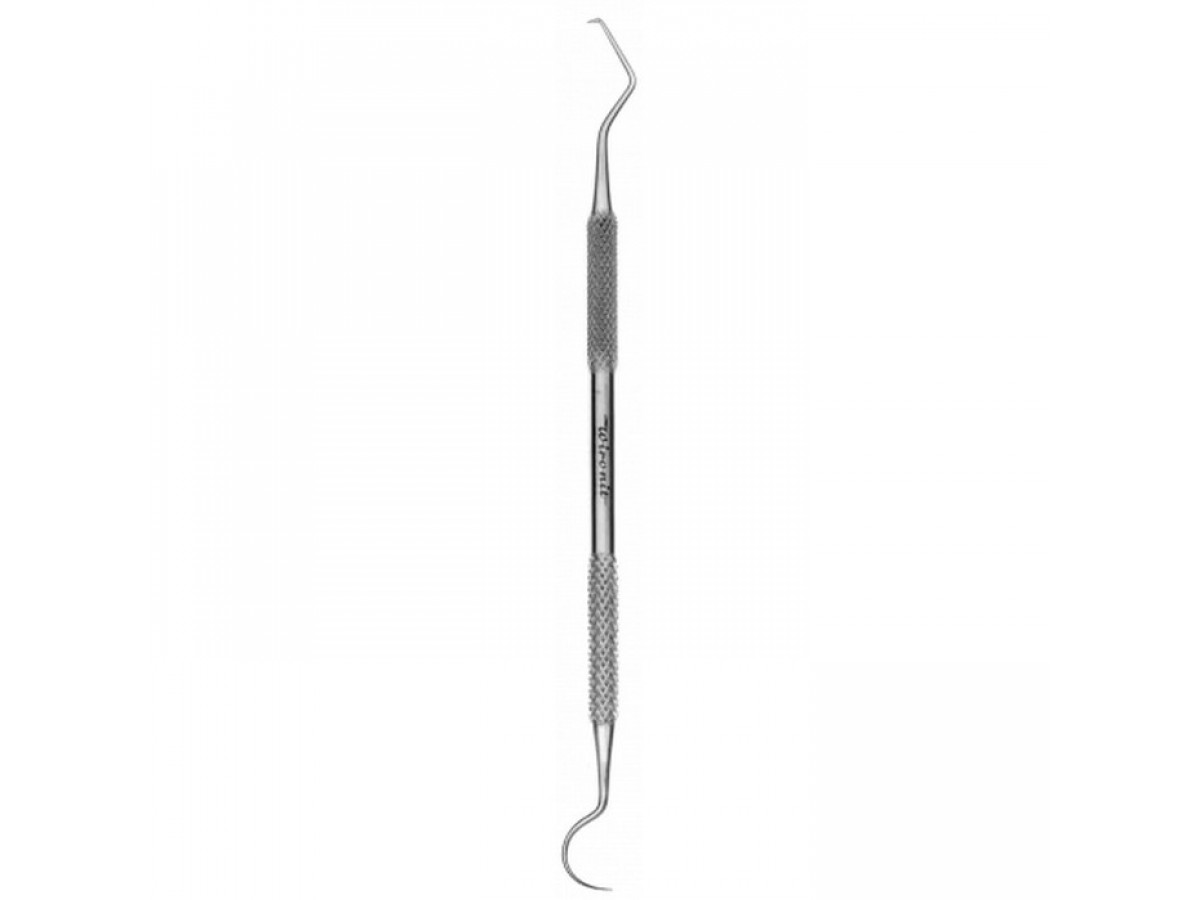 Удобная круглая ручка с ретенционным узором. Рабочая часть с одной стороны изогнутая и расположена под углом, с другой стороны серповидная. Произведен из виронита.