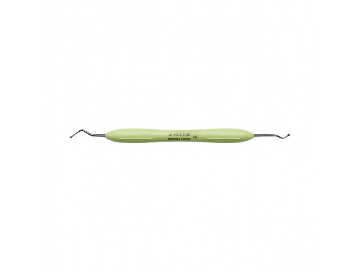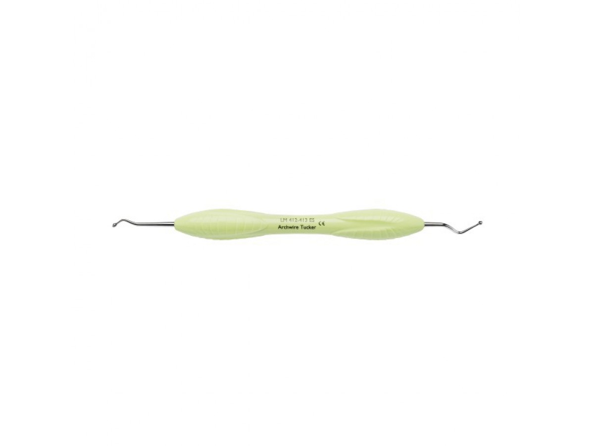 Процесс подгибания ортодонтической дуги может представлять сложности в условиях ограниченного пространства. Рабочая часть двустороннего инструмента для подгибания ортодонтической дуги представляет собой утолщенный шарик с отверстием 1 мм, в которое продевается ортодонтическая дуга. Затем дуга подгибается. Производитель: LM-Instruments Oy, Финляндия.