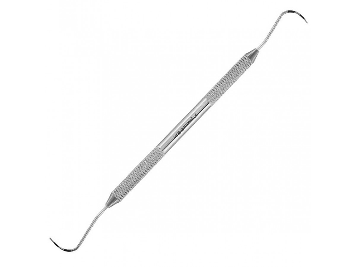 - С обоих концов двусторонней рукоятки зонда расположены зеркально отраженные рабочие части, каждая из которых имеет серповидную форму, изгиб по плоскости и уплощенный конец. На внешние поверхности рабочих частей инструмента нанесены цветовые маркировки в миллиметрах, благодаря которым можно легко обнаружить и определить глубину периодонтальных карманов.