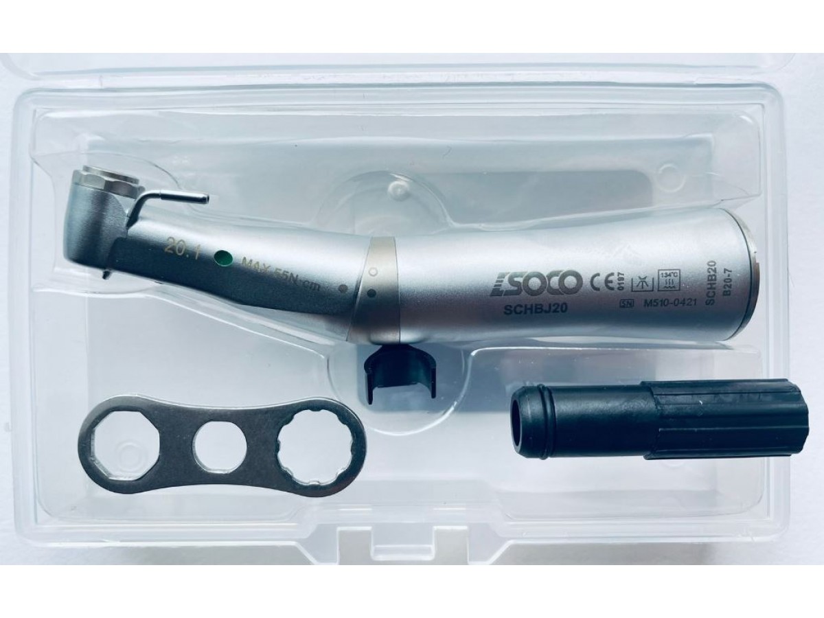 B20-7 – понижающий угловой наконечник, 20:1, с фиброоптикой, с внешней и внутренней подачей воды (Kirscher и Meyer). Предназначен для использования в имплантологии. Отличается от модели B20-4 быстроразборной конструкцией. Производитель: Soco, Китай.