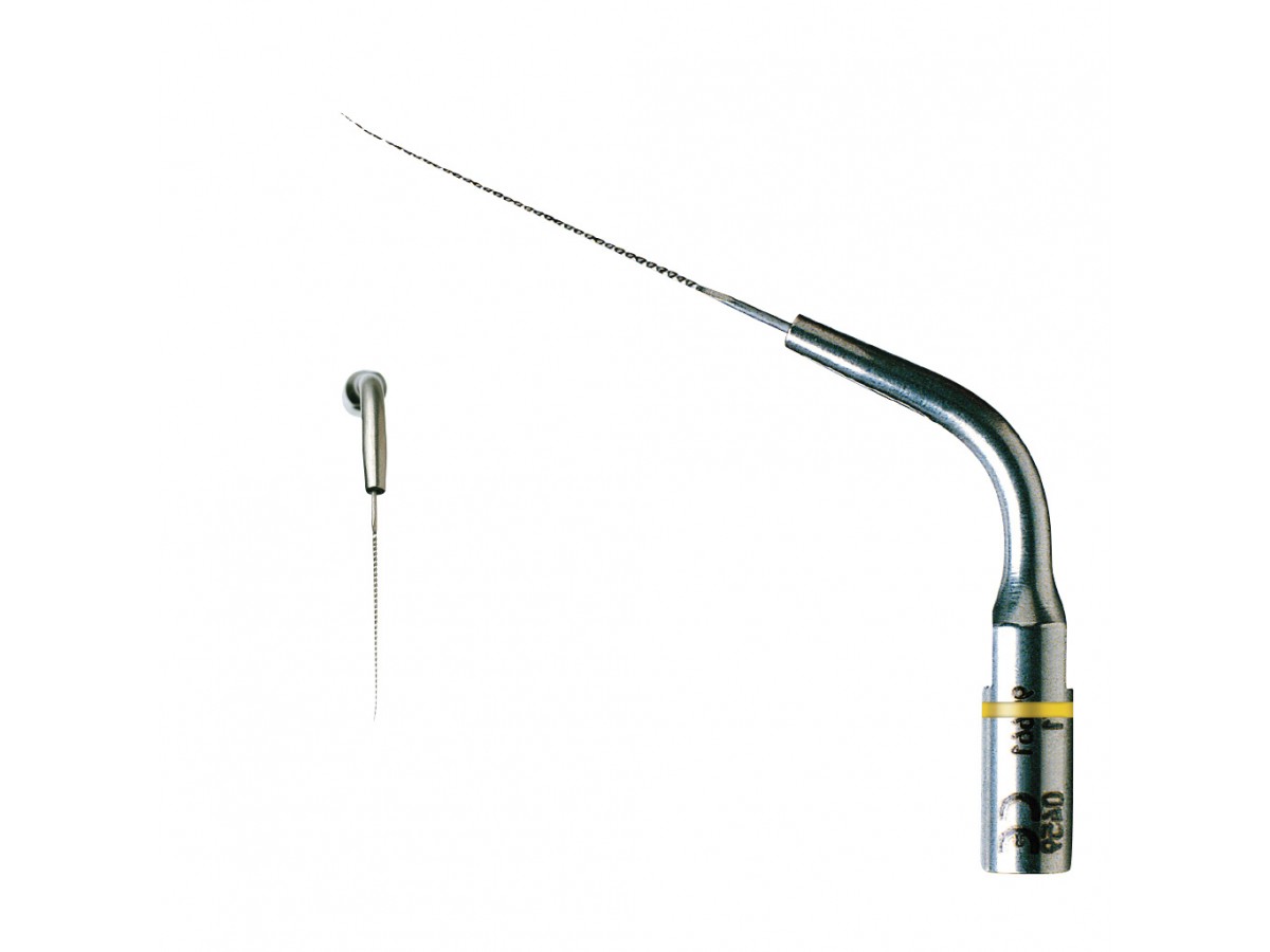 Ультразвуковые колебания насадки снимают необходимость вращательных движений в канале. Рекомендуется аккуратное равномерное продвижение инструмента на рабочую глубину корневого канала без длительных остановок насадки в какой-либо точке во включенном состоянии, во избежание формирования уступа кончиком насадки на стенке корневого канала в области его изгиба.