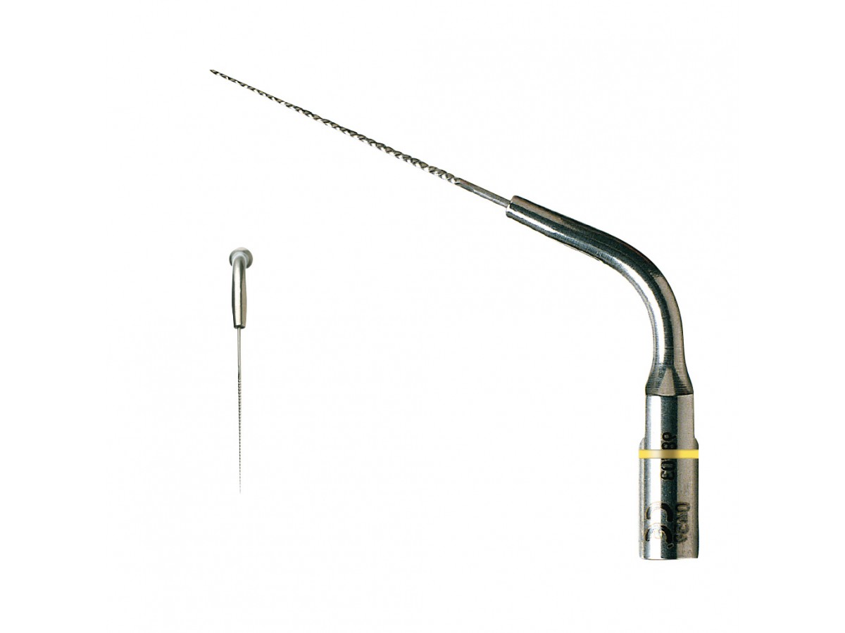 Ультразвуковые колебания насадки снимают необходимость вращательных движений в канале. Рекомендуется аккуратное равномерное продвижение инструмента на рабочую глубину корневого канала без длительных остановок насадки в какой-либо точке во включенном состоянии, во избежание формирования уступа кончиком насадки на стенке корневого канала в области его изгиба.