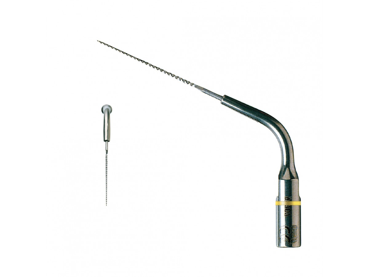 В сечении - квадрат, рабочая часть образована 4 спиралевидно закрученными гранями функционального стержня. Стержень зажат в теле угловой насадки, обеспечивающий удобное введение функционального стержня при стандартном эндодонтическом доступе в пульповую камеру зуба.