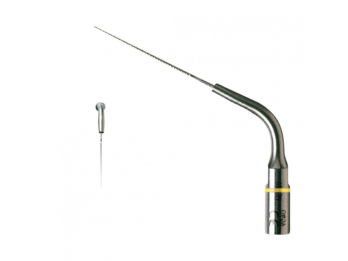 Ультразвуковые колебания насадки снимают необходимость вращательных движений в канале. Рекомендуется аккуратное равномерное продвижение инструмента на рабочую глубину корневого канала без длительных остановок насадки в какой-либо точке во включенном состоянии, во избежание формирования уступа кончиком насадки на стенке корневого канала в области его изгиба.