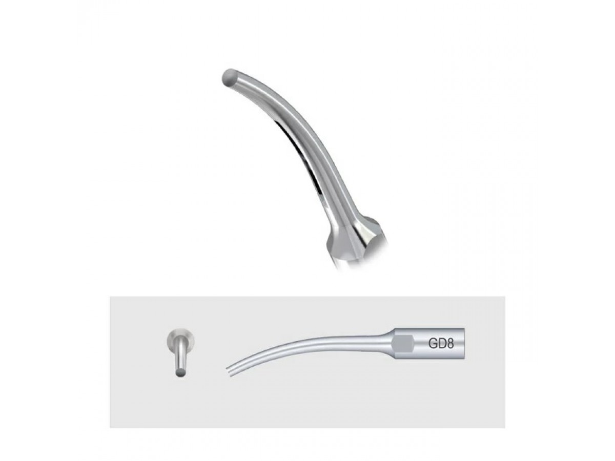 Насадка GD8 для удаления штифтов. Обладает высокой ультразвуковой эффективностью для удаления сложных деталей зубного протеза. Производитель: Woodpecker, Китай.
