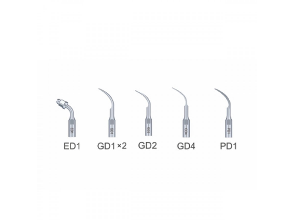 - GD1, GD2, GD4 – используются для удаления зубного камня с поверхности зуба с использованием ирригационной жидкости, поступающей через отверстие насадки.