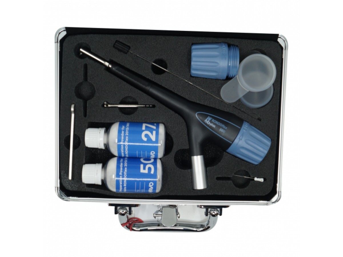 RONDOflex plus 360 - это система воздушно-абразивной пескоструйной обработки зубов с дополнительной подачей воздуха и сфокусированным потоком порошка.