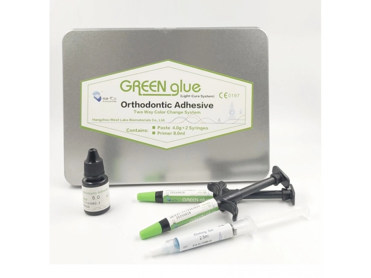 Адгезив ортодонтический Green Glue paste — универсальный ортодонтический адгезив для фиксации брекетов светового отверждения. Способен приобретать цвет и становиться бесцветным по желанию врача. Производитель: Westlake, Китай.