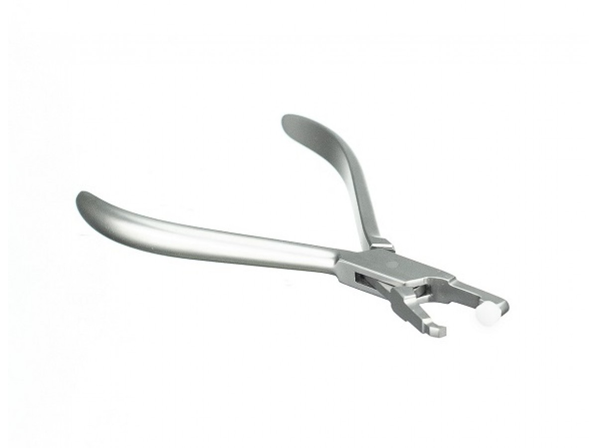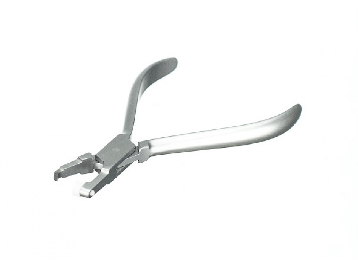 - Пластиковая подушка опирается на окклюзионную поверхность зуба. Аккуратно работая щипцами, производят скалывание адгезива с эмали зубов.