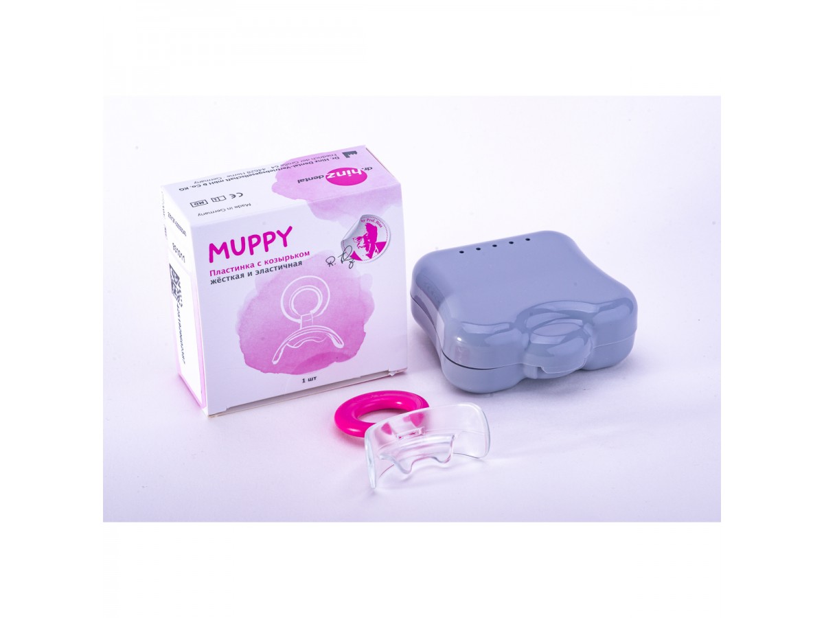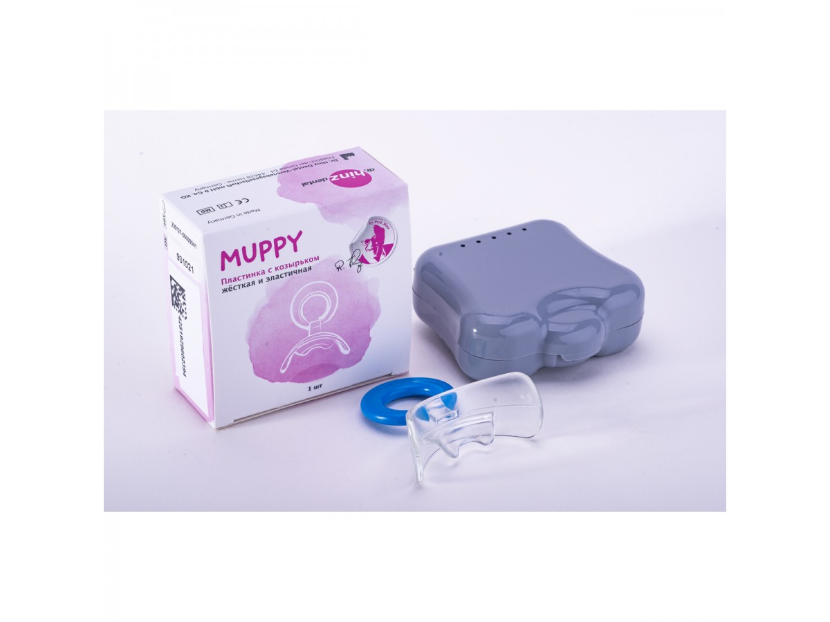 Пластинка Muppy – это тренажер для исправления и профилактики аномалий прикуса. Предпочтительный способ лечения для всех отклонений II класса при наличии большой сагиттальной щели во фронтальном отделе. Пластинку можно использовать и в случае развивающейся аномалии III класса, перевернув ее козырьком вверх. В таком случае ребенок цепляет верхними зубками козырек, автоматически выдвигая верхнюю челюсть вперед, что со временем приводит к нормализации положения челюстей. Производитель: Dr. Hinz Dental, Германия.