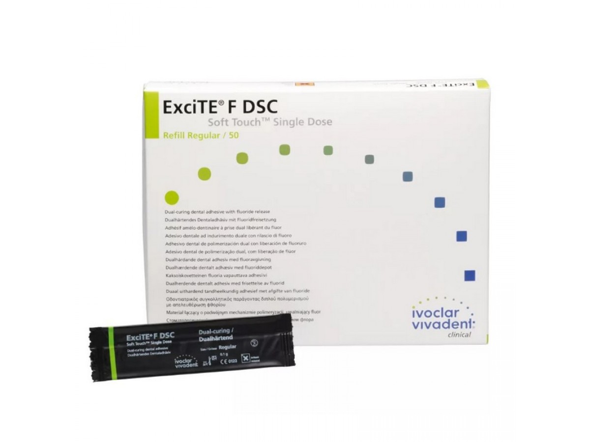 ExciTE F DSC – Dual cure Single Component – это двойного твердения выделяющий фтор адгезив для применения в технике тотального травления (total-etch). ExciTE F был дополнительно модифицирован для применения в клинических ситуациях, при которых невозможно использовать свет для полимеризации (например, цементировка корневых штифтов или непрямых реставраций) или применяется композит химического твердения. Производитель: Ivoclar Vivadent, Лихтенштейн.