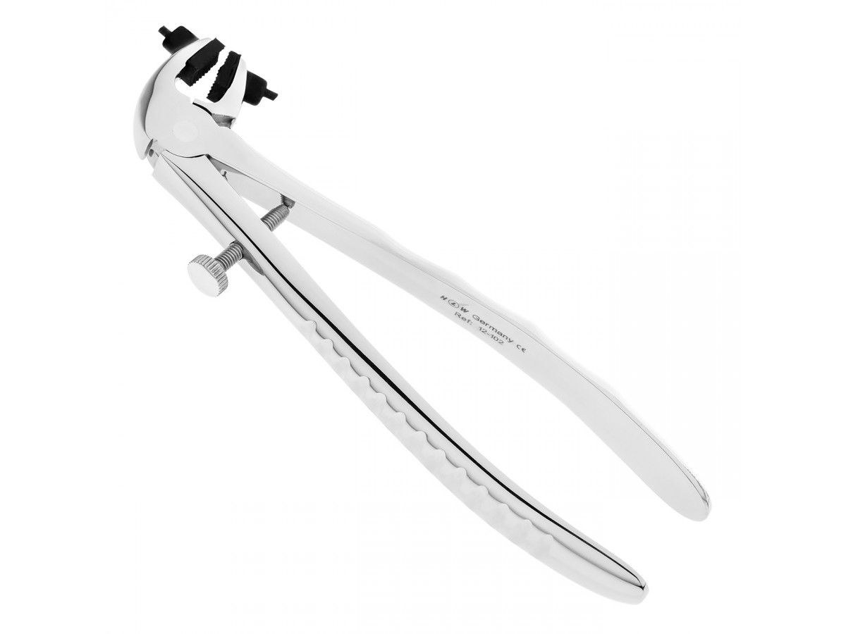 - В одну из ручек инструмента ввинчен ограничитель хода рабочих частей, предотвращающий излишнее сдавливание и деформацию хрупких ортопедических конструкций.