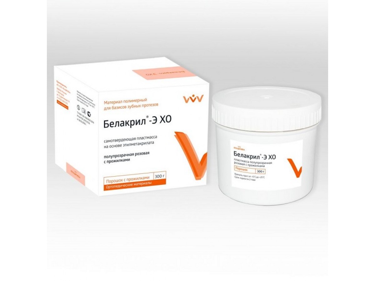 Белакрил-Э ХО полупрозрачная розовая с прожилками - базисный материал самотвердеющий, предназначенных для починок и перебазирования съёмных зубных протезов, а также для изготовления и ремонта ортодонтических и ортопедических аппаратов и конструкций. Производитель: ВладМиВа, Россия.