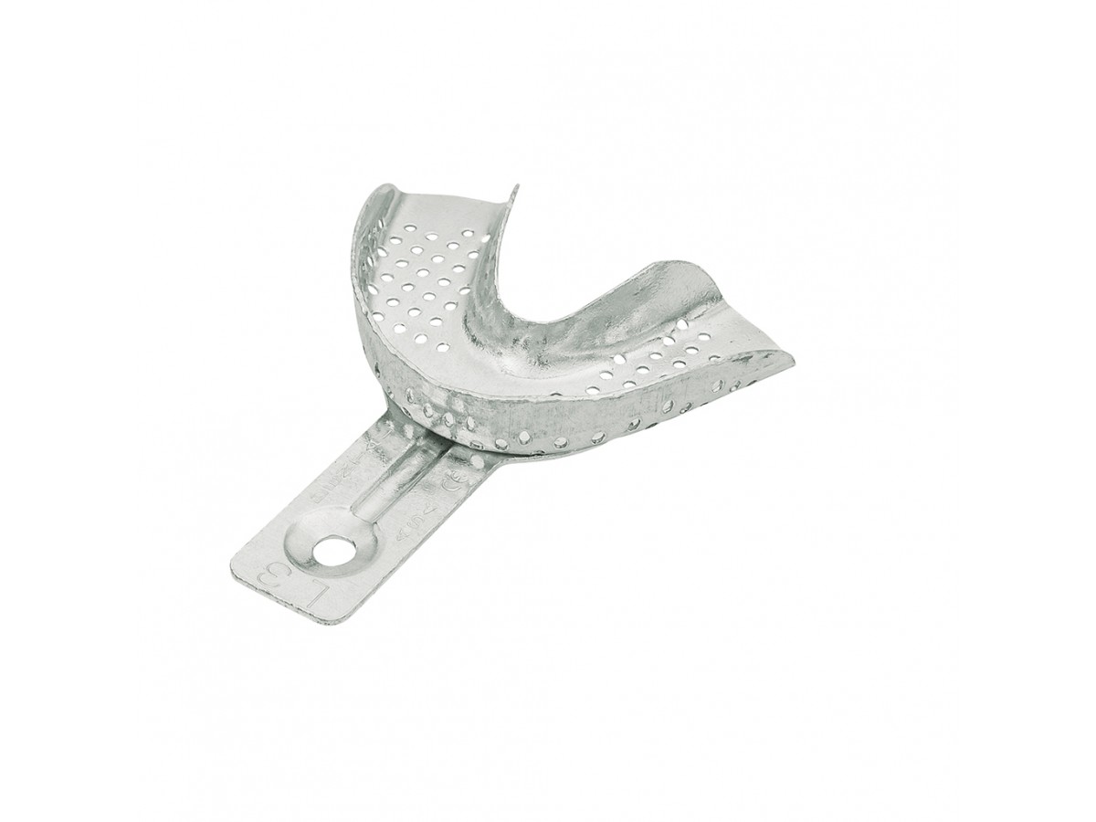 Ложка слепочная нижняя большая (L) с перфораций без бортика, детская, из аллюминия. Размер 69*48 мм. Ложки изготовлены специально для детей. Очень гибкие и лёгкие, Низкие края ложки, чтобы лучше адаптироваться к анатомии детской челюсти. Производитель: Asa Dental, Италия.