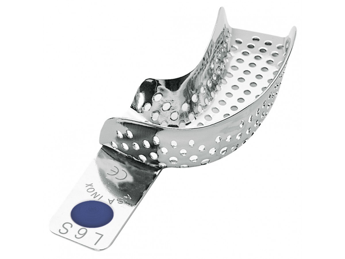 Ложка слепочная нижняя большая, половина (L) с перфорацией без бортиков (правый верх-левый низ). С силиконовой цветокодированной вставкой для более легкого извлечения слепочной ложки из полости. Производитель: Asa Dental, Италия.