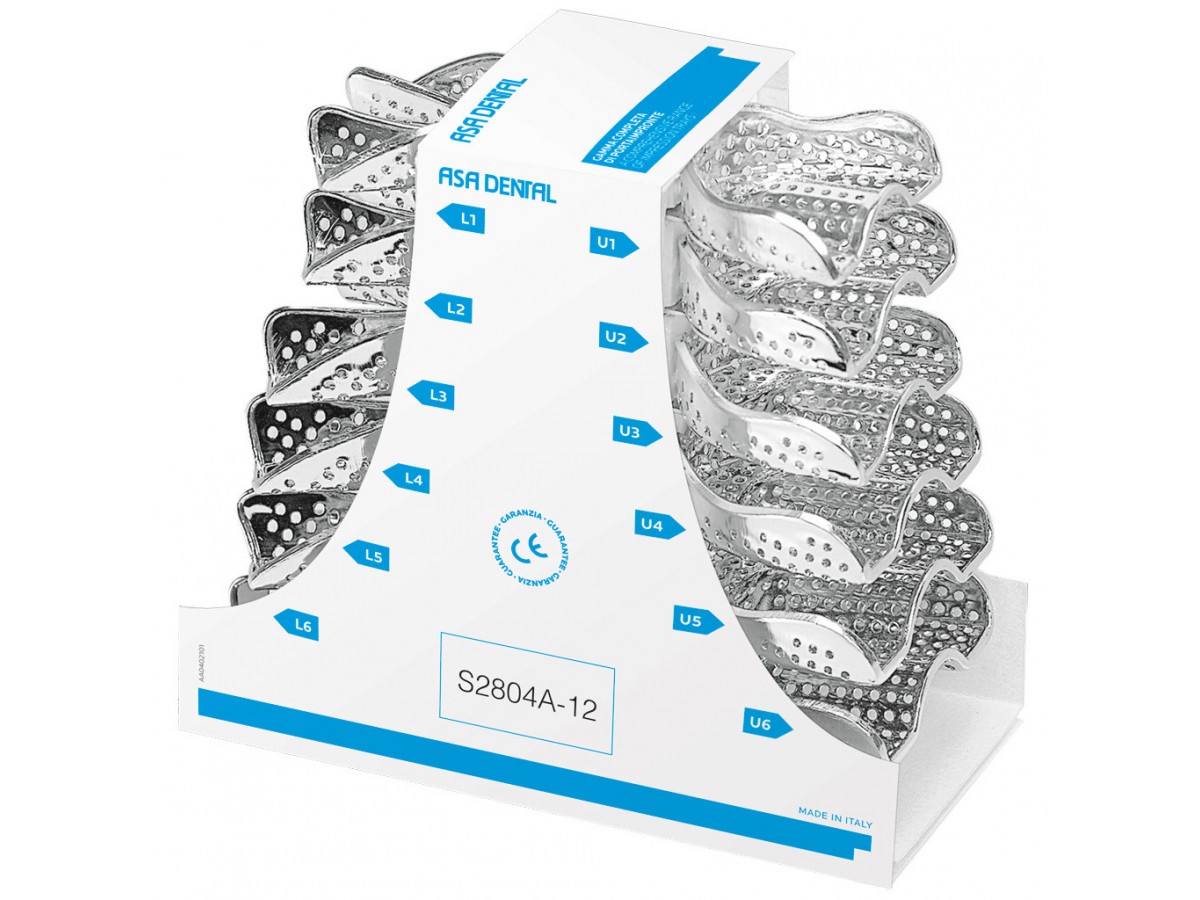 Ложка слепочная с перфорацией с бортиками, набор 12 штук. (низ: XL, L, M, S, XS, XXS, верх: XL, L, M, S, XS, XXS ). Производитель: Asa Dental, Италия.