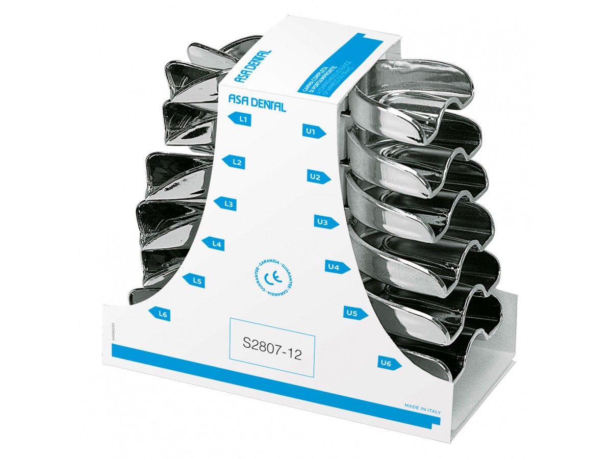 Ложка слепочная без перфорации с бортиками, набор 12 штук (S,M,L, XL верхние и нижнии). С бортиком. С пластиковым цветокодиковынным кружком, удобно держать при снятии слепка. Производитель: Asa Dental, Италия.